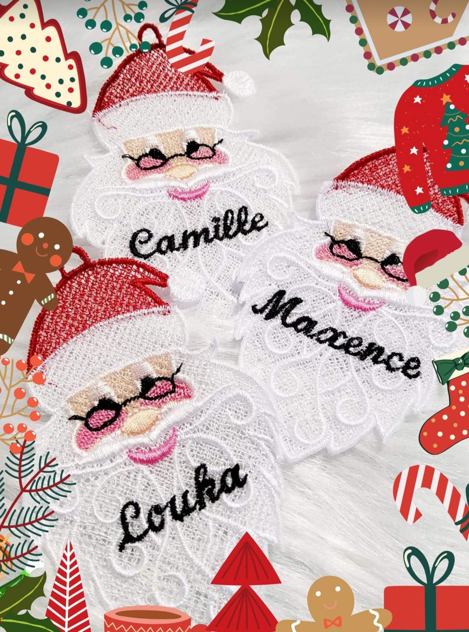 Ajoutez une touche personnelle et enchantée à votre sapin avec nos adorables Suspensions Père Noël personnalisables, réalisées avec la délicatesse de la broderie dentelle !